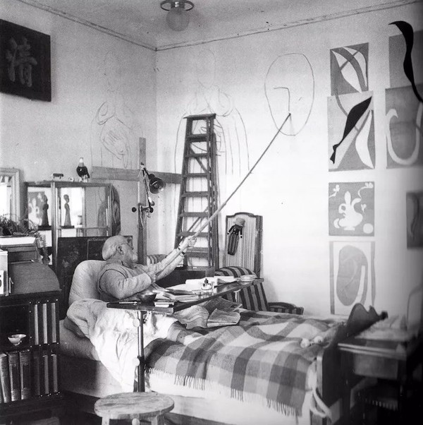 另一方面,受制于身体疾病的艺术家们,也能躺在床上完成创作。1949年,亨利·马蒂斯因病卧床无法动弹,但是此时他的教堂设计已经进行到一半了。于是,马蒂斯将自己的公寓房间“变成”了教堂的空间,他将画笔绑在棍子上创作。