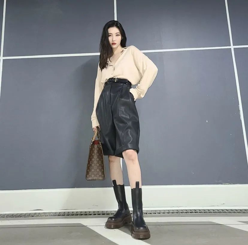 宣美则选了个低调的色系,与全身的大地色调搭配,皮短裤和皮靴组合,姐姐把秋天的专属元素一口气全穿出来了,妥妥的性感洒脱大美人儿。