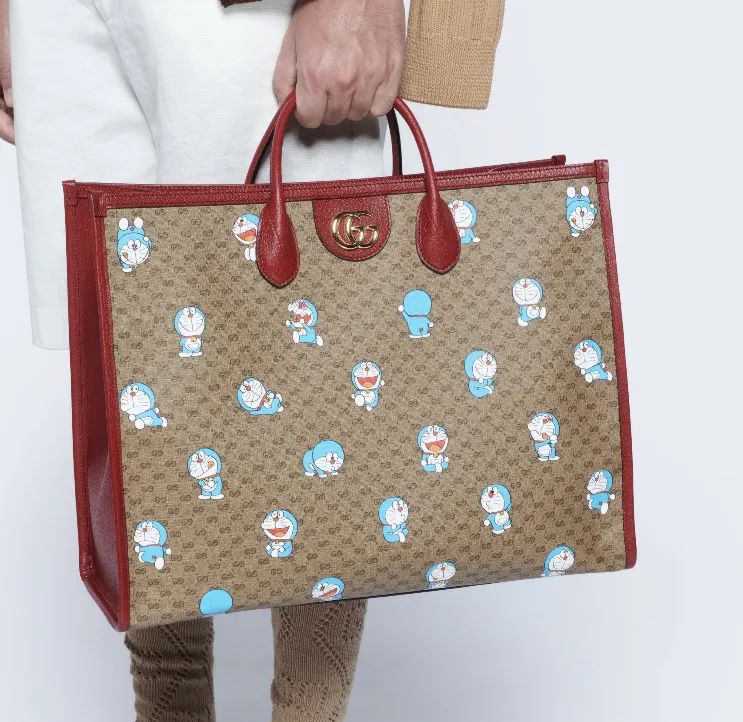 除了怀旧,GUCCI在2021春夏系列中还搞起了童心未泯的好玩创意,把哆啦A梦、唐老鸭都搬到了GG TOTE BAG上,开心、贪吃、生气的表情都敲可爱!