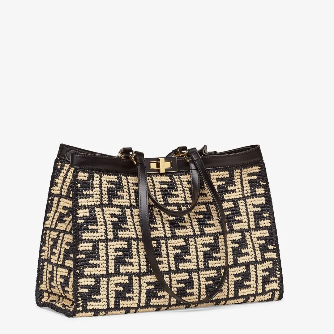 看了皮革材质后,不如换个口味,来看看FENDI这款拉菲草材质的Peekaboo X-tote手袋,高级的酒红色配米色FF图案,重现品牌经典扭锁做点缀,很有味道。