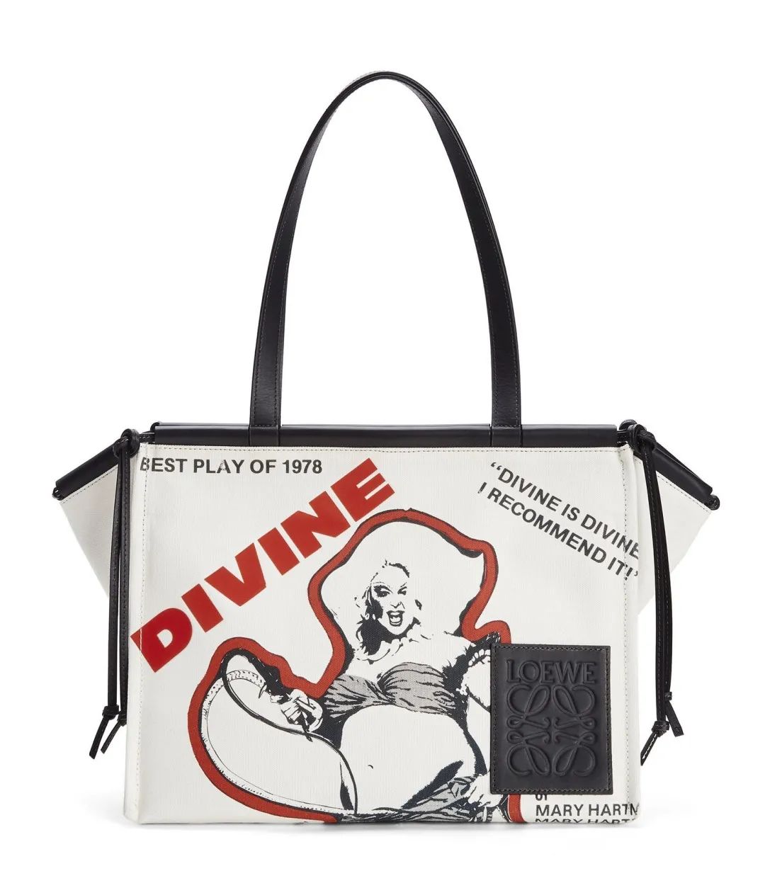 以Cushion Tote为原型,LOEWE✖️Divine合作系列的帆布手袋,印有1978年理查德·伯恩斯坦(Richard Bernstein)在《霓虹女人》中的图案,是Divine限量版系列的一部分,向这位超越生活的美国演员致敬,非常有纪念意义。