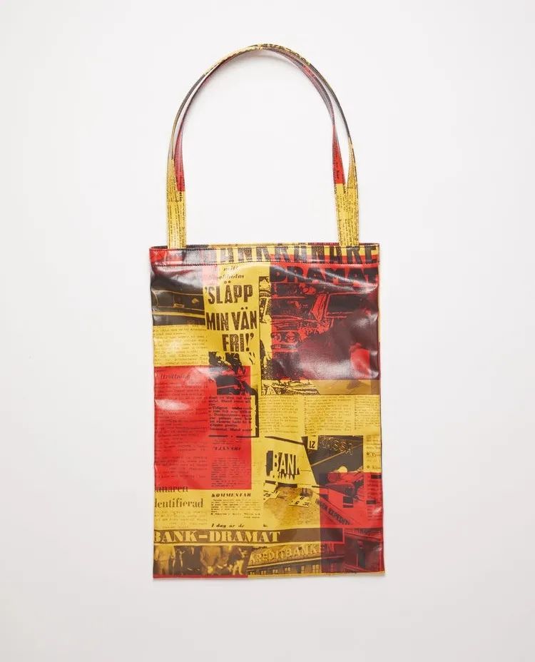为了纪念Norrmalmstorg店铺开幕,Acne Studios还推出了斯德哥尔摩综合征胶囊系列,其中的油布TOTE BAG设计拼贴了当时关于犯罪事件电视报道的简报印刷图案,生动形象地把故事写进了包袋中,是值得收藏的一款。