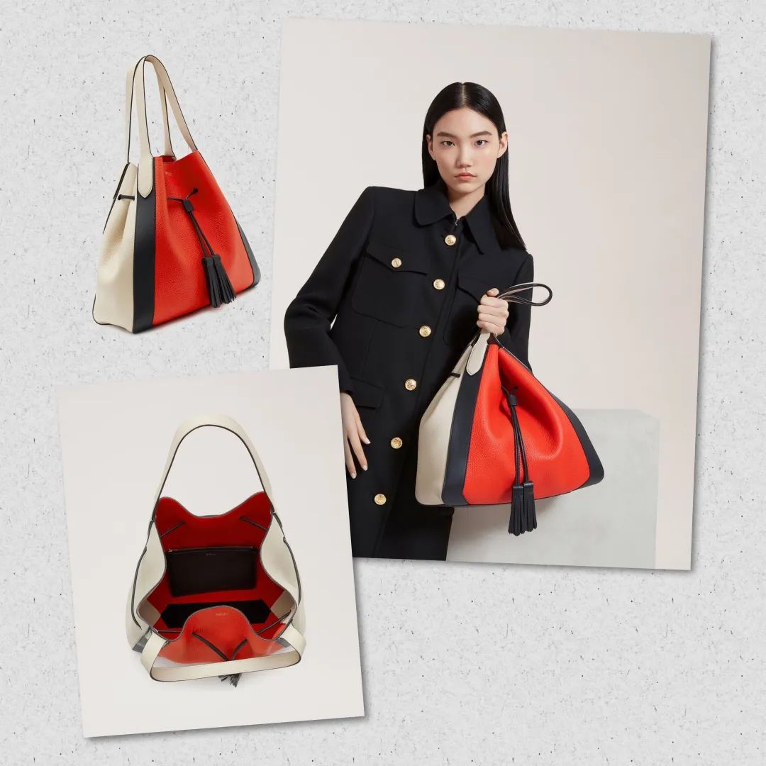 如果你想走英伦风路线,可以搞一个Mulberry Millie系列的TOTE BAG过把瘾,鲜亮的拼接色设计给简单的包包增添了生机与活力,双流苏抽绳的线条让包包看上去很有律动感,背上后精致优雅的成熟魅力女人就是你了。