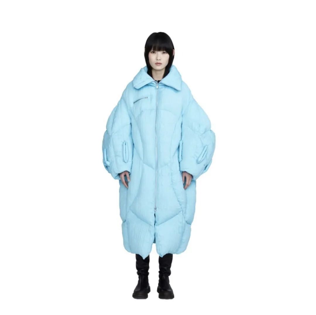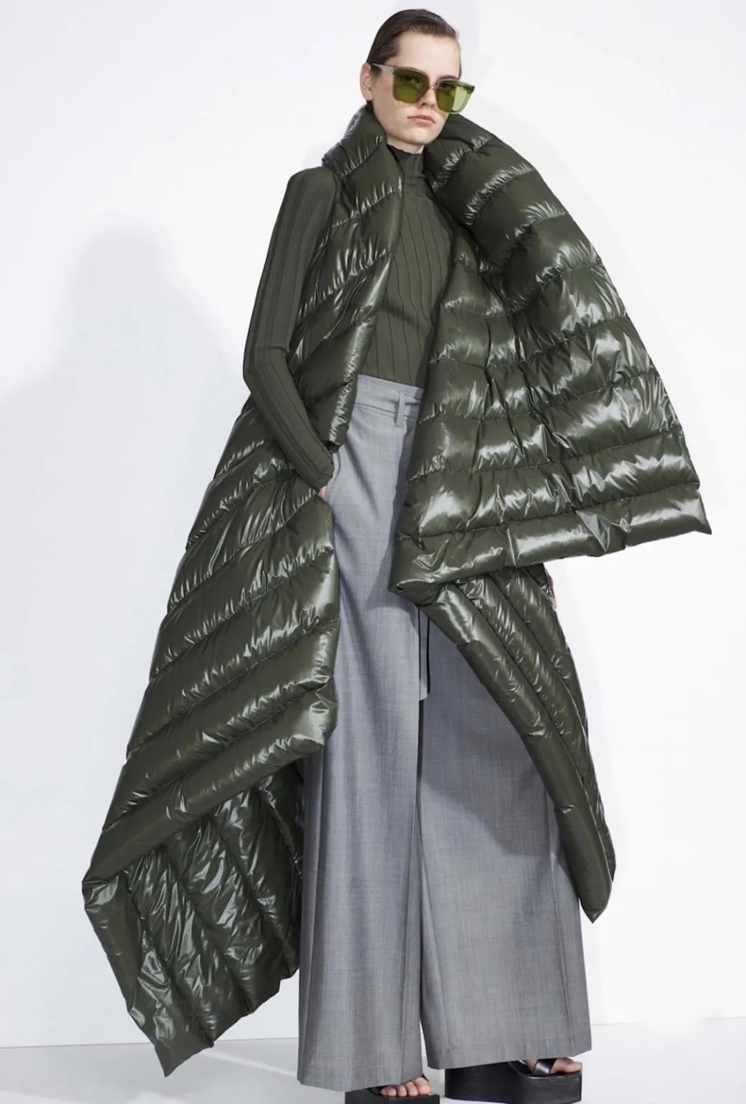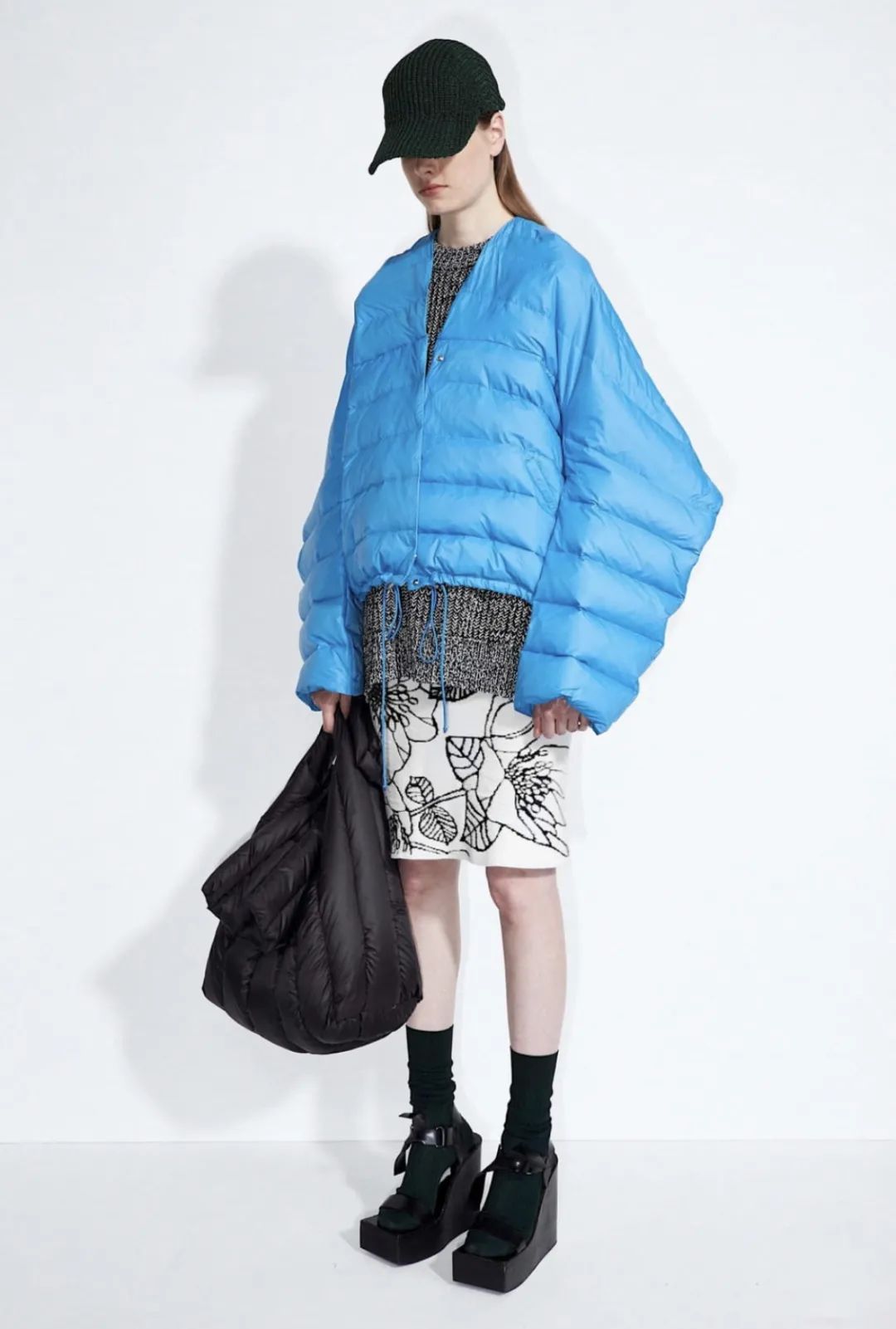 CHRISTIAN WIJNANTS 2021春夏系列(右)不管是拱形结构还是一片式的羽绒大披肩,都可以看出设计师希望通过极具造型感的设计,来打破大家对羽绒服抱有的固有形态意识。