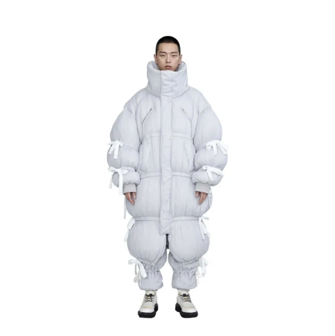 即使是长款羽绒服设计,在细节处因为多加了巧妙的蝴蝶结绑带,有种米其林轮胎升级改造的既视感,萌萌的又很有趣。