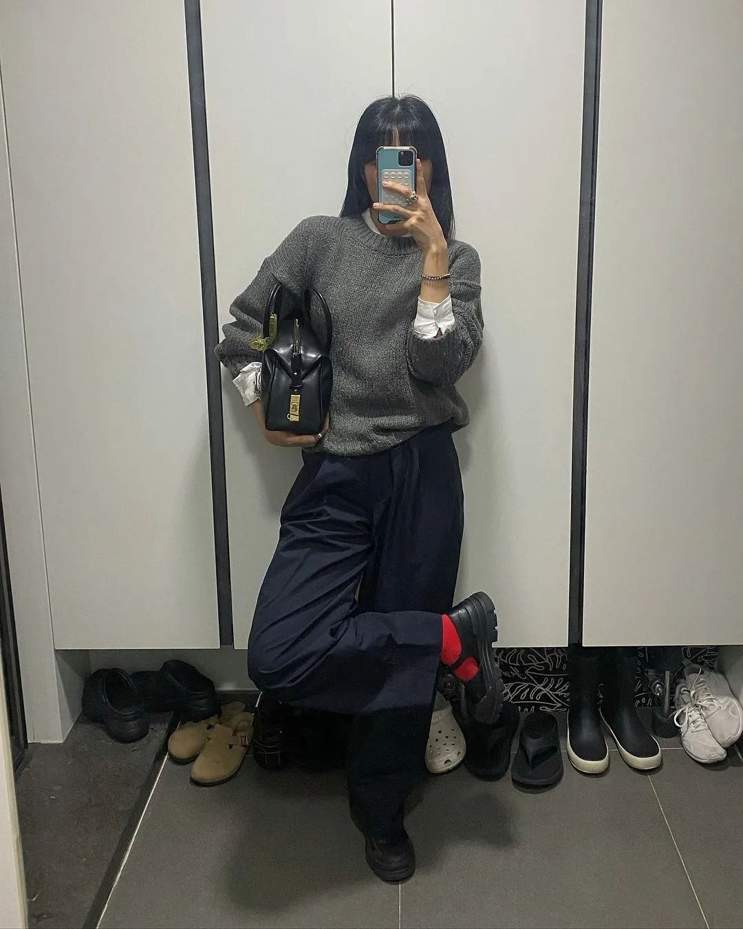 除了可以藏秋裤,那些爱穿的高跟鞋、厚底鞋,也统统可以藏在宽松的裤角里,既能再次为腿长加码,又实现了走路带风的畅快。阔腿裤的好,我们已经get到,但如何穿起来才能远离“矮腿星人”,还需要几个小技巧:好比例法则第一条:能高腰时便高腰。通常高腰的板型能够形成视觉错觉,达到优化比例的目的,尤其在穿着厚重的秋冬季节,拉长腿长后能够化解一部分的臃肿。