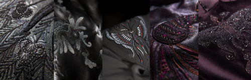 贵州苗绣被誉为“无字史书”,是华夏文化中的璀璨瑰宝,十种苗族刺绣技法、十种苗绣包款,成为本季磅礡阵仗中最为细腻的精彩看点。以五色苗―白族、花族、黑族、红族、青族成为色系灵感,呈现出白金、粉红、黑金、红黑与蓝色等丰富的色彩层次。关键造型中,以服装结构变化为核心,皮百褶、澎百褶、长短摺、男装裤脚百褶交替运用,重新诠释苗族传统服饰中—百褶花裙;加长的大衣、斗篷、披挂件延伸轮廓,堆栈出大器的迁徙与漂泊氛围;串珠、羽毛、流苏与铃铛的点睛,勾勒神话故事中—百鸟衣的传奇意象。