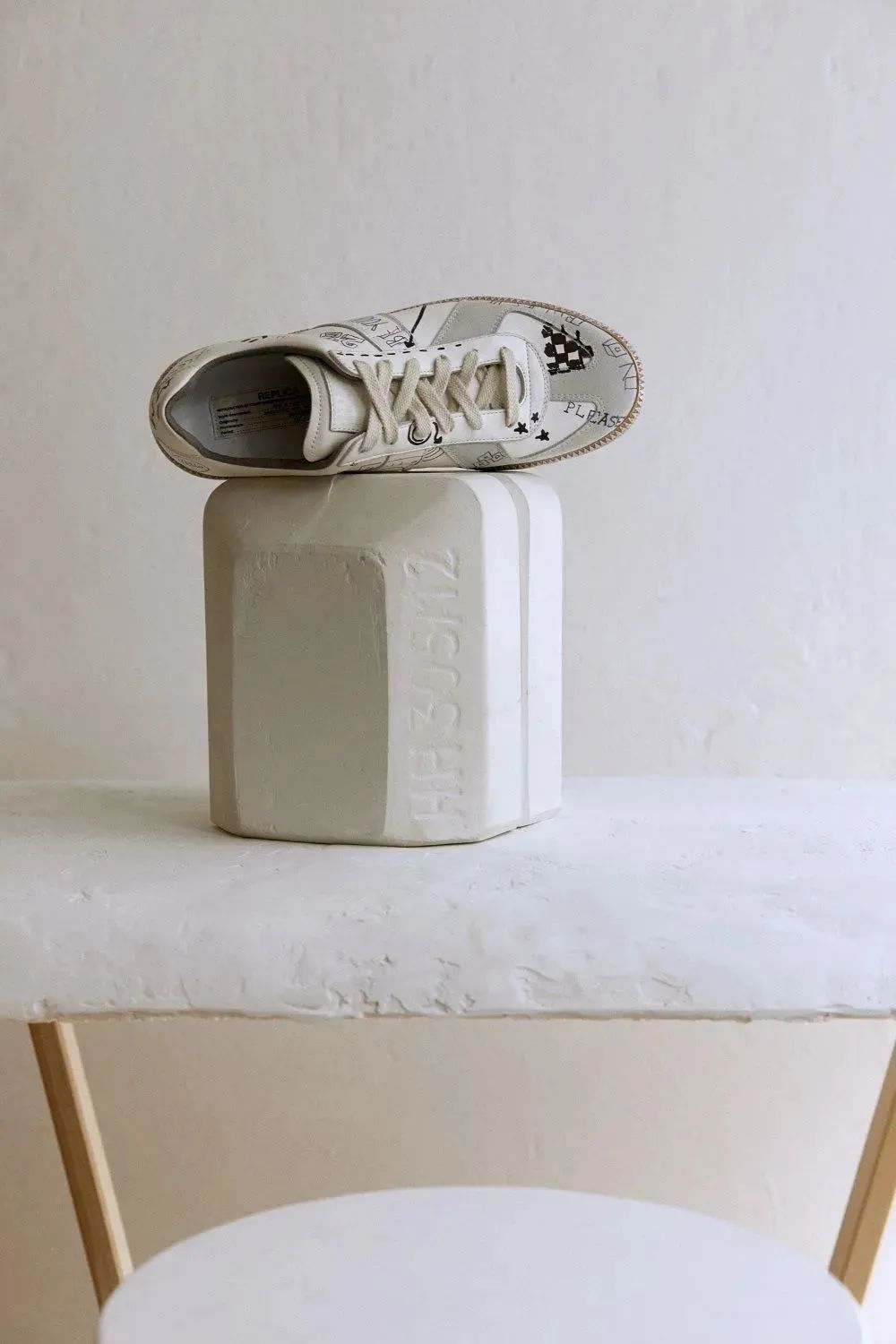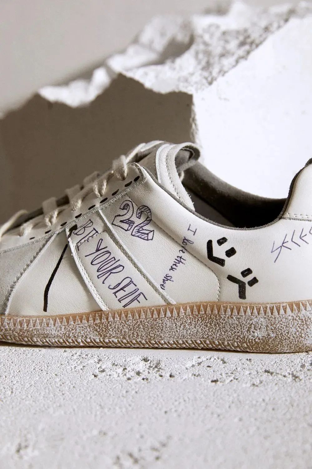 黑色马克笔和深蓝色钢笔标记与运动鞋柔和的白灰色相间的鞋面形成鲜明对比,橡胶鞋底也覆盖着类似于白色油漆的设计,将街头艺术风格展现的淋漓尽致。