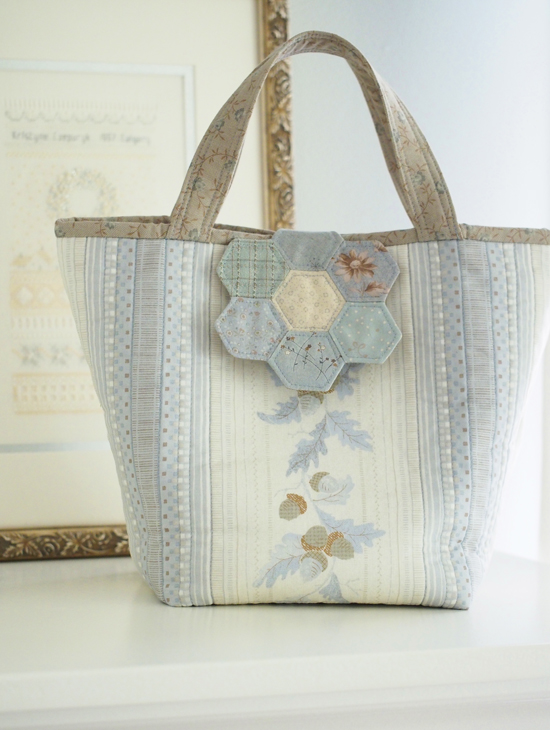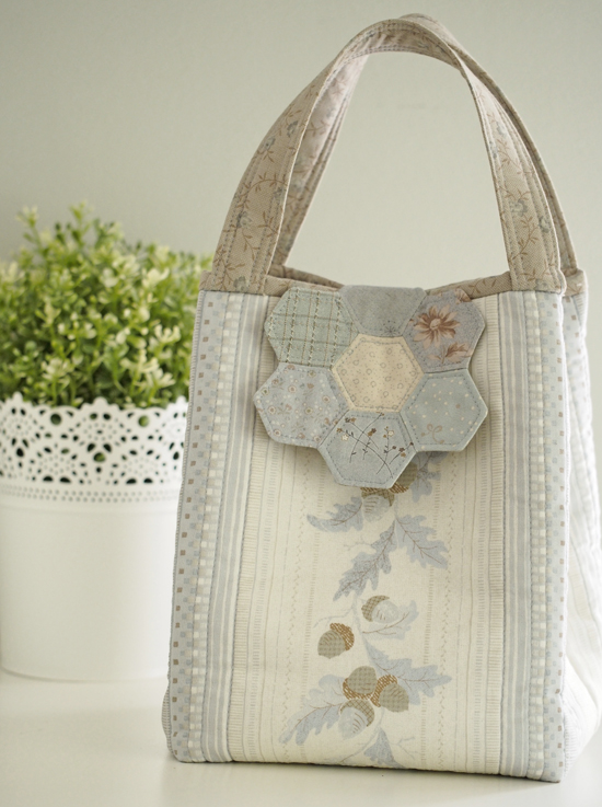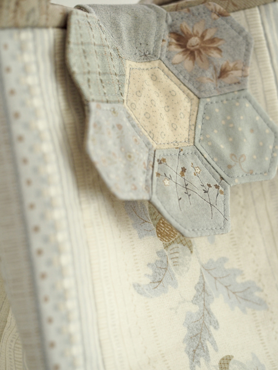 她从她珍藏的日式布料中选择了一些合适的旧零碎布料来制作了这个六边形花朵翻盖。
