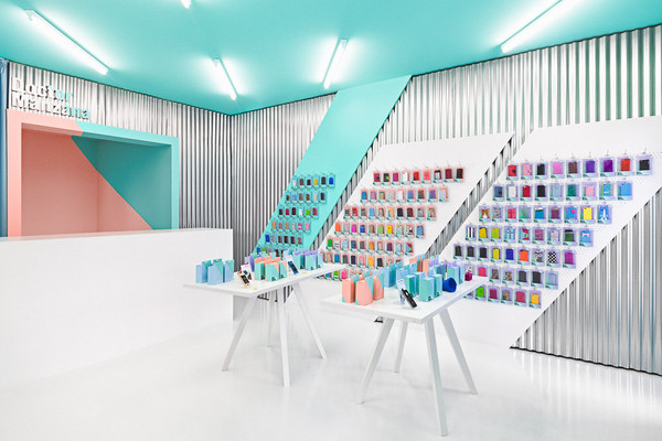 虽然一些细节还是以隐喻的方式联系到医院,比如蓝色幕帘,但整个店内气氛是以科技和工业感为主,如镀锌瓦楞板材质的运用。白色家具则带来温暖光线的质感。