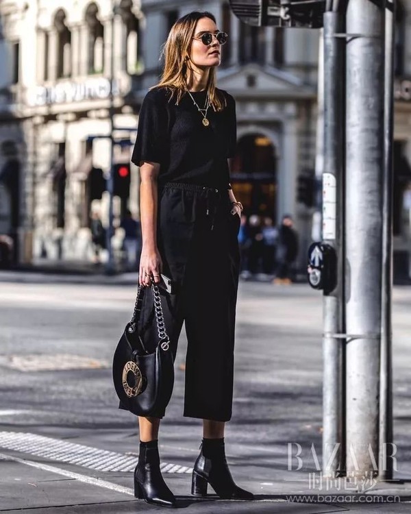 想要又酷又瘦?你可以用黑T恤搭配同色系列九分裤、短靴及挎包,够酷够瘦就是你。