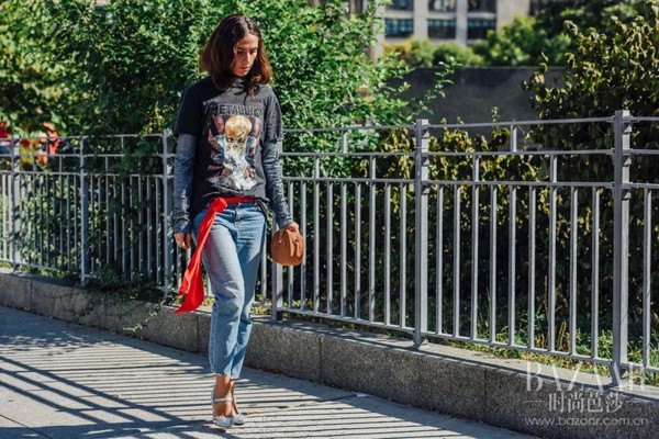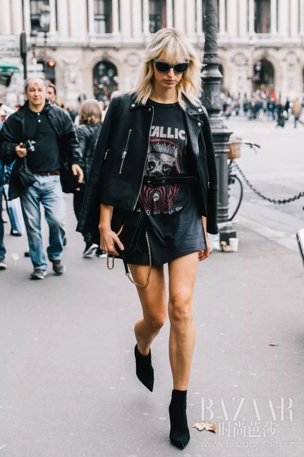 搭配裙子穿也是同理,宽松的上半身黑T一定和腰部有收紧作用的裙子一起穿,微胖的女士还可以把T恤扯成单肩穿,能起到瘦3斤的效果。