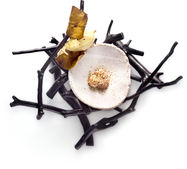 ↑↑↑交错的黑色树枝,粗糙破损的瓷器餐具,呼应着盘中看似简单却工序复杂的料理。