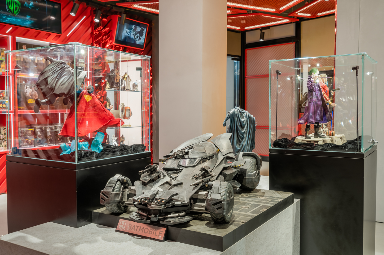 一楼展区特设诺兰执导的《蝙蝠侠:黑暗骑士》三部曲系列产品展柜,蝙蝠侠、小丑、吉姆·戈登、双面人等经典角色齐聚,搭配主题背景卡,还原影片中各高能场景;而电影中各种突破想象的载具也在此震撼还原,包括蝙蝠侠载具:蝙蝠车及蝙蝠摩托、反派贝恩的迷彩蝙蝠车和影片结尾蝙蝠侠驾驶的蝙蝠战机,载具迷狂喜!
