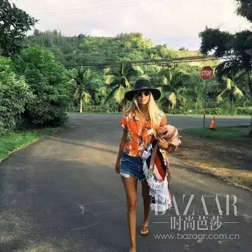 充满了热带风情的草裙小人图案,搭配一条牛仔裤俏皮又可爱!