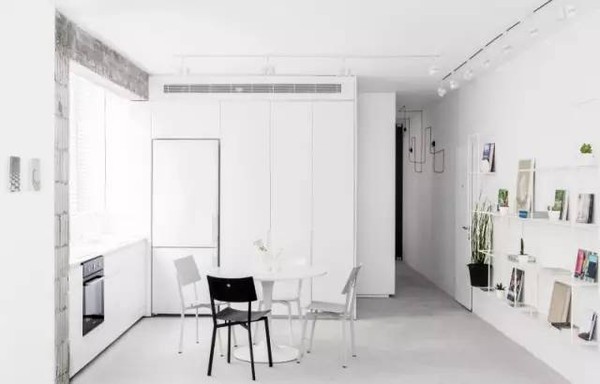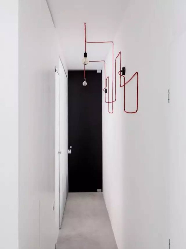 细长的公寓(长19米,宽3.7米)被划分成格子式的平面布局,一个八米长的网格架子沿客厅墙壁延伸,白色铁质材料与窗框呼应,电网作为项目的设计概念,在公寓的家具、照明和造型设计中都有体现
