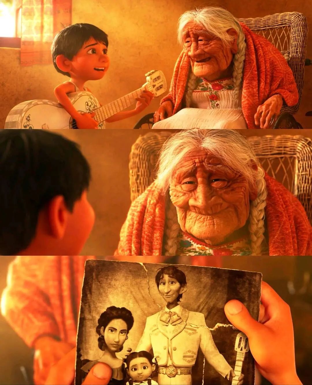 当年米格的高祖父为了音乐而远走他乡,抛下了家人一去不回。高祖母一气之下绝不允许家族里任何人再碰音乐,家族里唯有神志不清的曾外祖母可可不反对音乐,所以米格最亲近她。