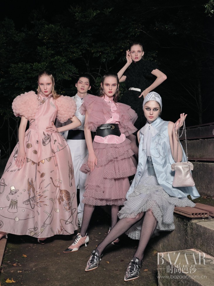 款式上除了堆栈的裙装,也按着马戏团中魔术师形象为灵感,出现许多中性挺拔轮廓套装,西装背心、灯笼裤、伞状西装外套等单品,以及风格一致的尖头拼接系带穆勒鞋、尖头拼接单鞋搭配,侧写出女魔术师率性浪漫并具的模样。