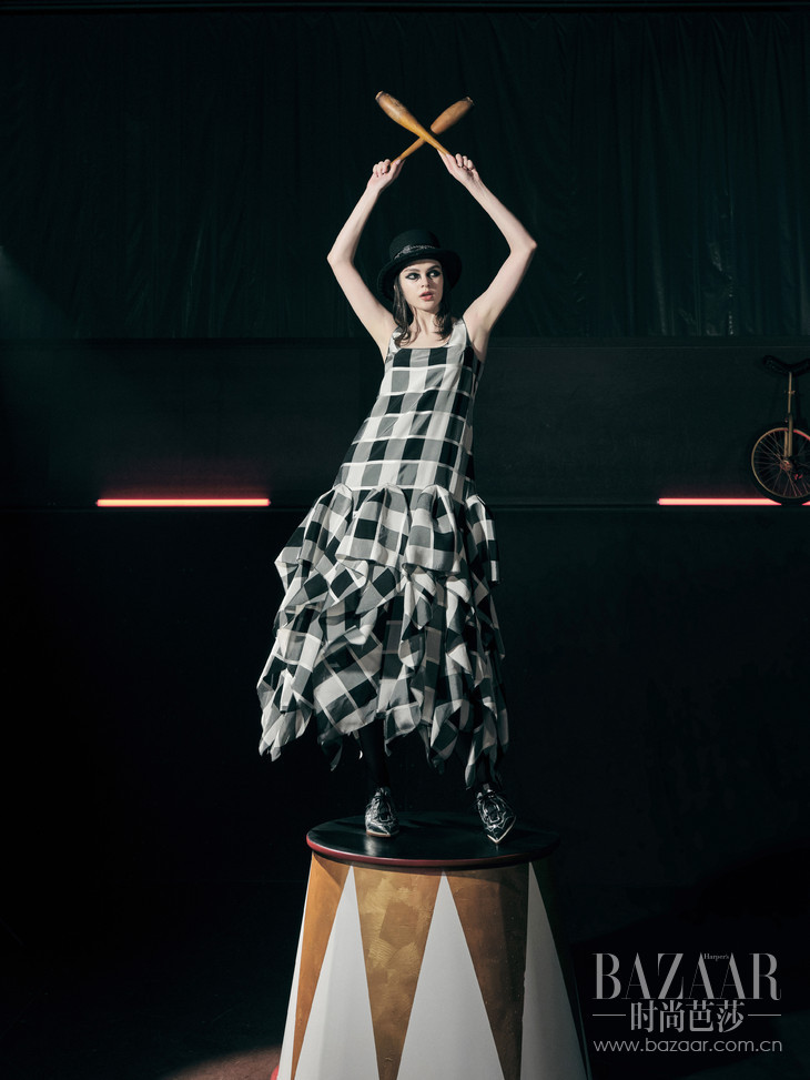 服装上时而搭载着本季独家开版印花,以超现实手法呈现马戏经典元素,有温度最高的蓝火光火圈、匍匐前行的东方形象老虎、摆荡钢索间的空中飞人,象征着冒险与挑战。