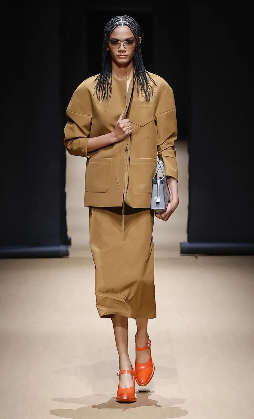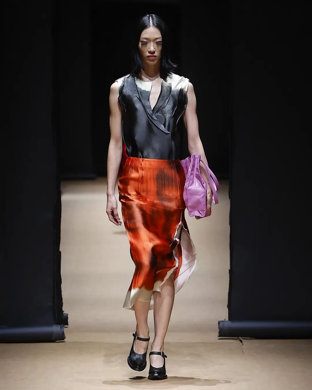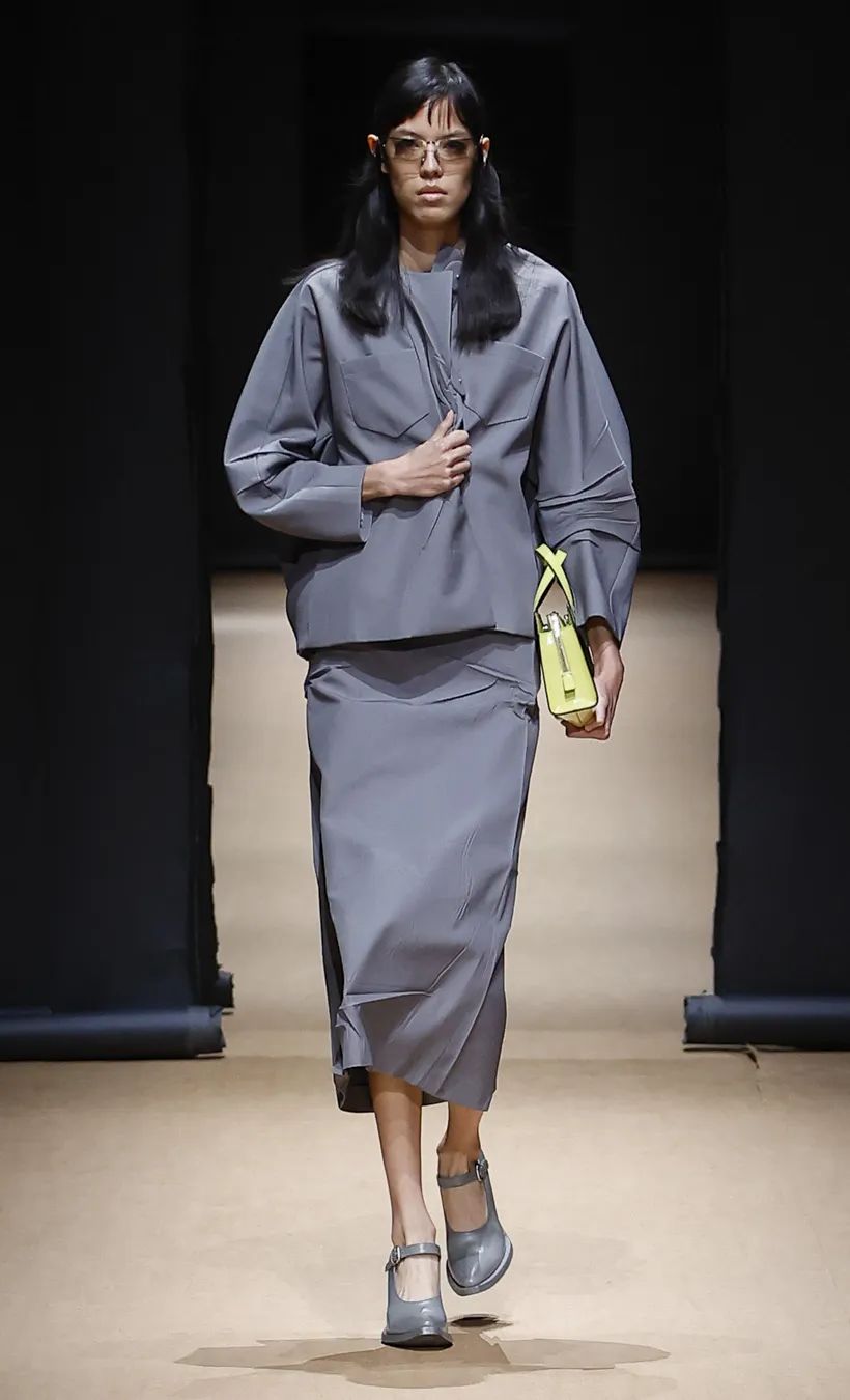 其中最令人惊喜的,是围绕“纸张”质感展开的有趣实验。Miuccia Prada认为,纸是最简单、最质朴的材料。它代表最原生的天然状态。在不少单品中,均可看到对纸张质感的模拟。廓形外套和半身裙的下摆都真实地模拟了被揉皱的纸张纹理,加以配合模特的手抓姿态。裙装则仿佛一整张被捏皱的“纸”,以褶皱作为曲线,展示身体与时装的亲密与自由。