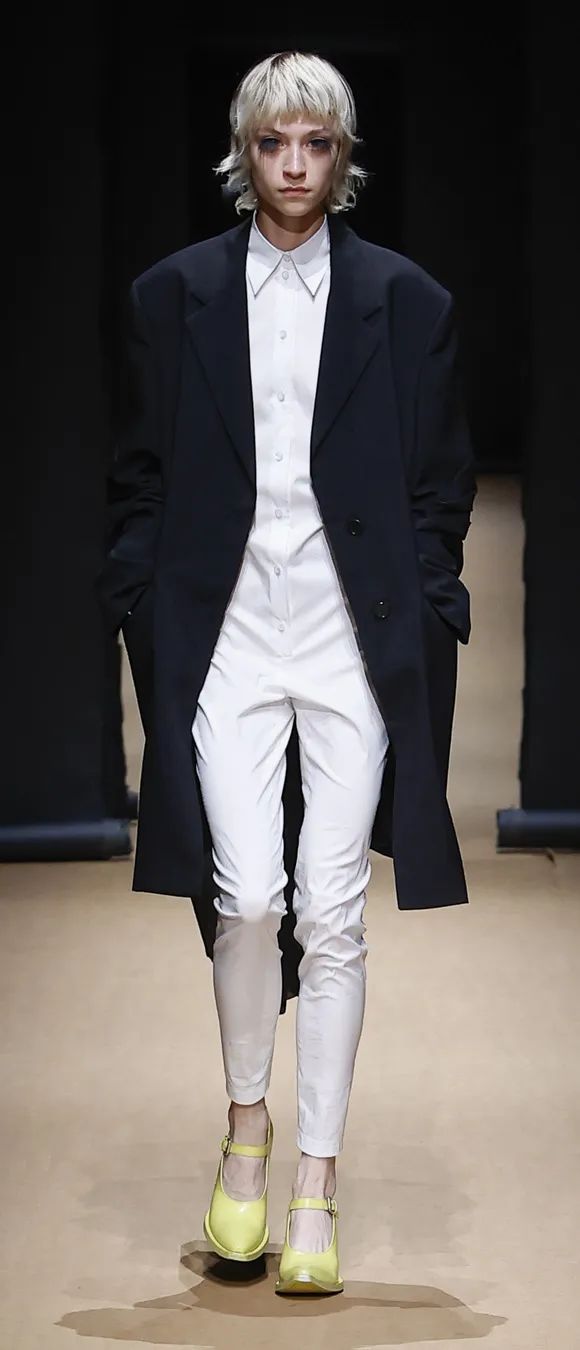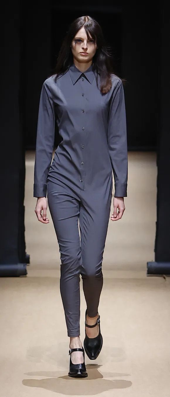 衬衫连体衣则是本季令人印象深刻的作品。将Prada制服概念和工业色调的府绸连体衣相融。穿透性别区隔,利落简洁。