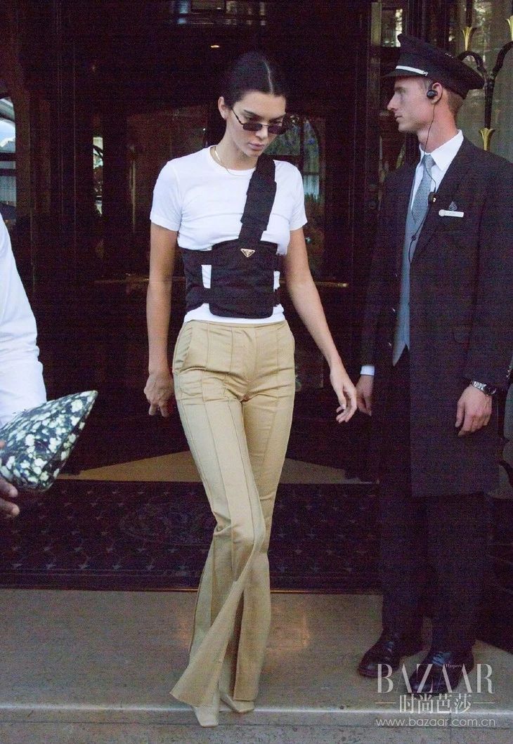 除了精心搭配将中性玩出女性的妩媚,随性的街头运动风套起来也带种酷酷的性感。用防弹式腰包配上紧身喇叭裤勾勒出完美身形,看起来毫不费力,却混搭出不一样的新一代超模形象。