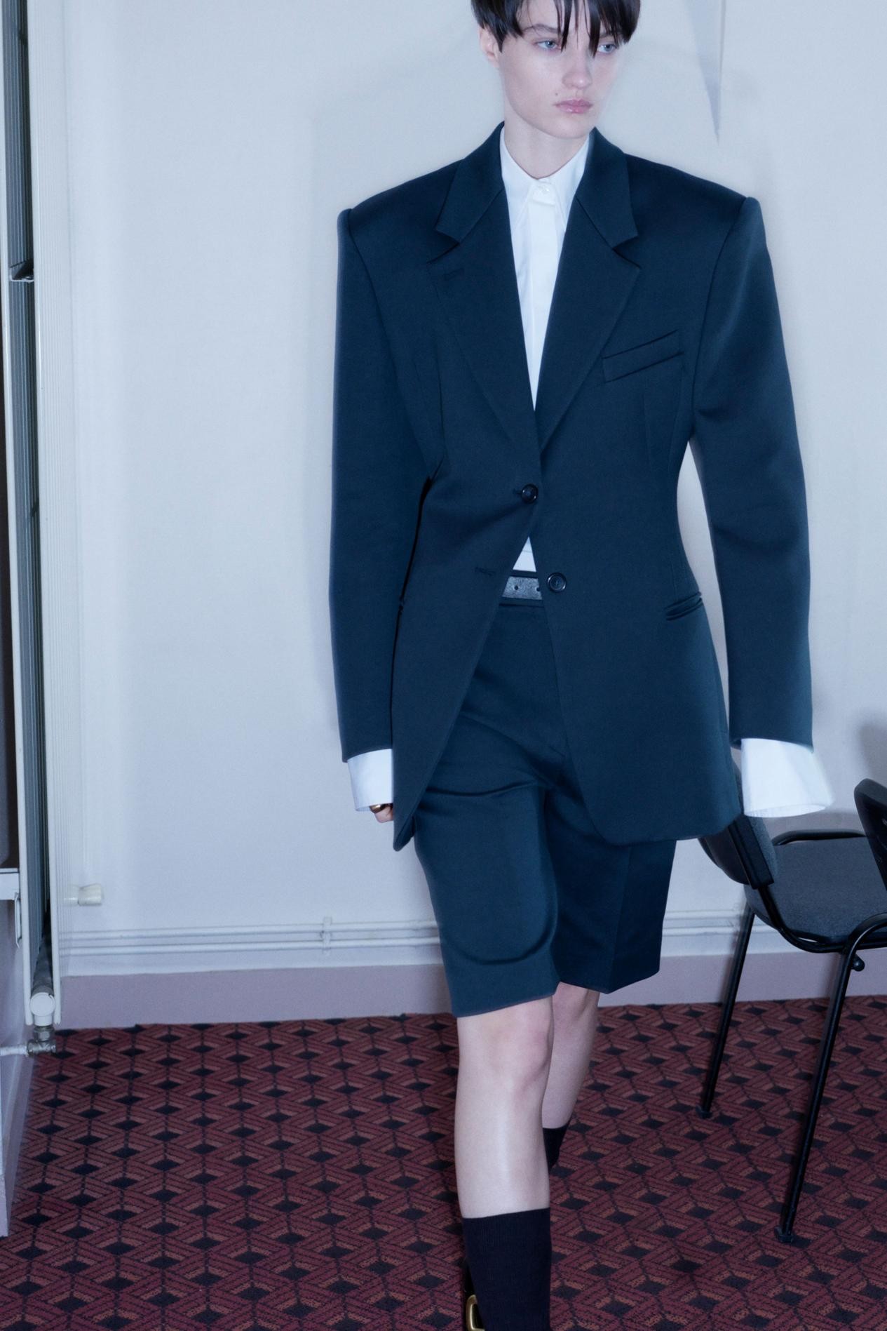 深色西装的简约廓形加上硬朗垫肩,随意搭配白色衬衫就能轻松驾驭各类场合,下身选择短裤皮靴或者是宽松的直筒裤,可以说是通勤首选。