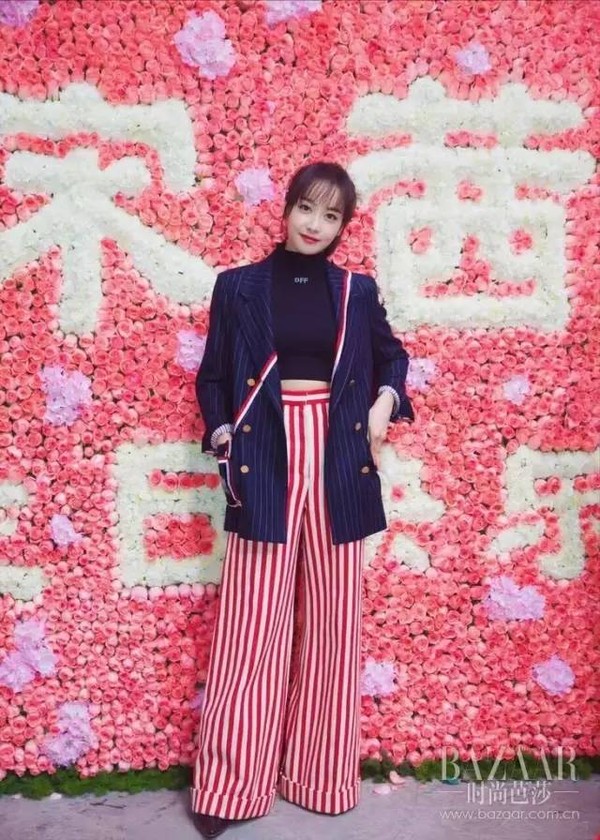 宋茜这条Chanel红白竖条纹阔腿裤搭配西装夹克,内搭Off-White短上衣,很好地延展了腿部线条,明亮的配色给大家带来春天的气息~