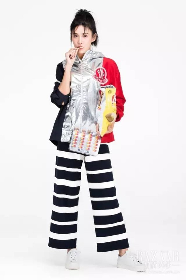 张蓝心的黑白条纹阔腿裤搭配纯白球鞋,露出一点脚踝也能从视觉上拉长双腿,谁说横条纹会把人拉宽的?