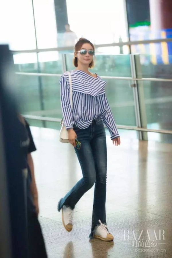看似简单的衬衫+牛仔裤,袁姗姗却能穿出新意!解构不规则型条纹衬衫很是抢眼,紧随2017春夏潮流~