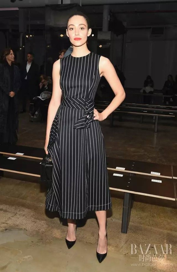 艾米·罗森的黑色条纹收腰系带连衣裙搭配黑色尖头高跟鞋,红唇加以点缀, 超有范气场爆表!