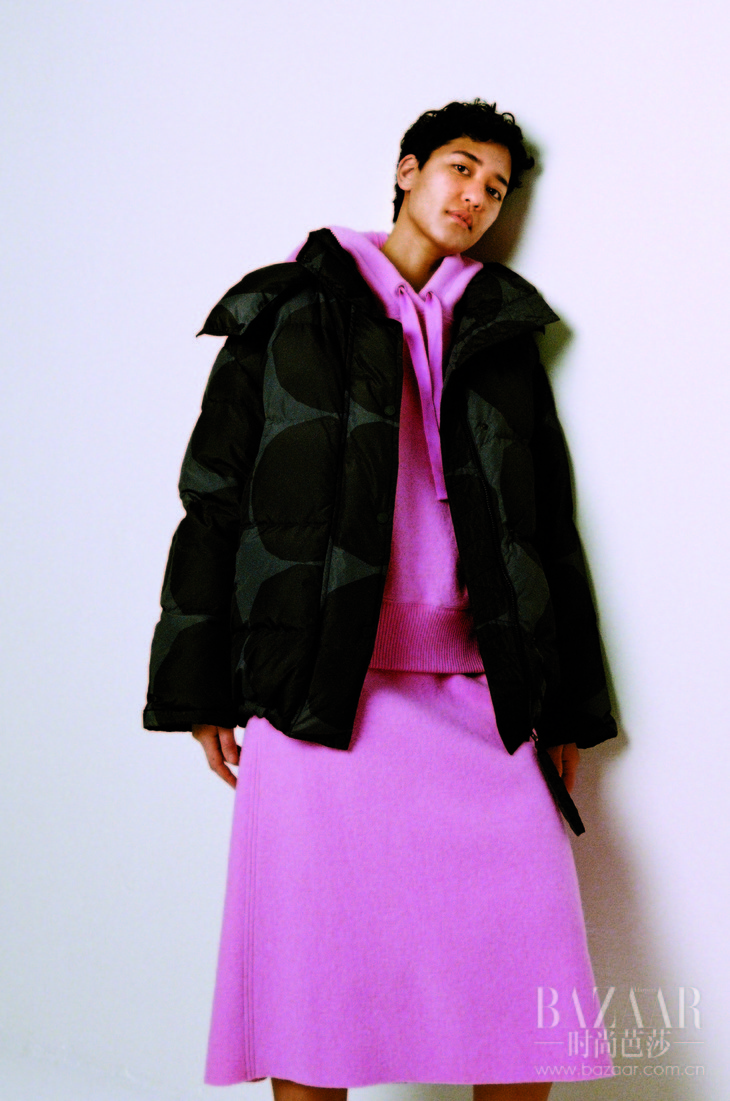 本季兼具功能性和设计感的羽绒服运用了经典的Unikko(罂粟花)和Kivet(石块)印花,同时采用了再生聚酯纤维为主要面料。Unikko印花外套在Marimekko经典羽绒服的设计风格基础上,融入了对当代设计理念的全新体会,其内衬也部分取材自可再生植物原料。Kivet印花外套内填充的禽类羽绒和羽毛来源可溯、采集方式可靠,轻盈而保暖。这两款茧型外套都具有略微扩型且可拆卸的风帽,打造出更具运动感的蓬松温暖造型。