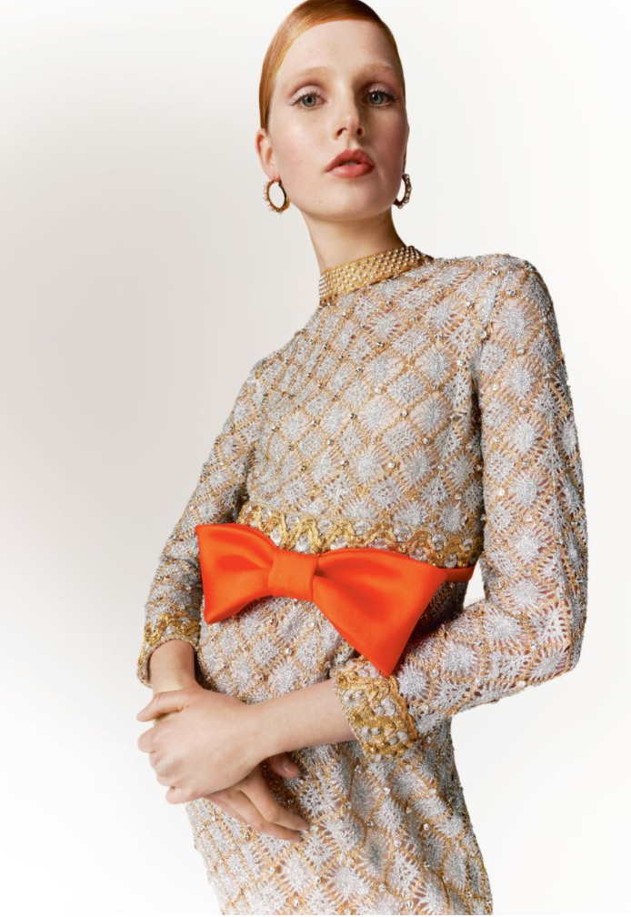 蕴含着历史故事感的礼服,在改造上也是巧费心思,比如将这件20世纪60年代Francoise Hardy式连衣短裙,融入了Miu Miu招牌感的珠宝镶嵌设计,让颜色单一的古董服饰一下有了宫廷感。