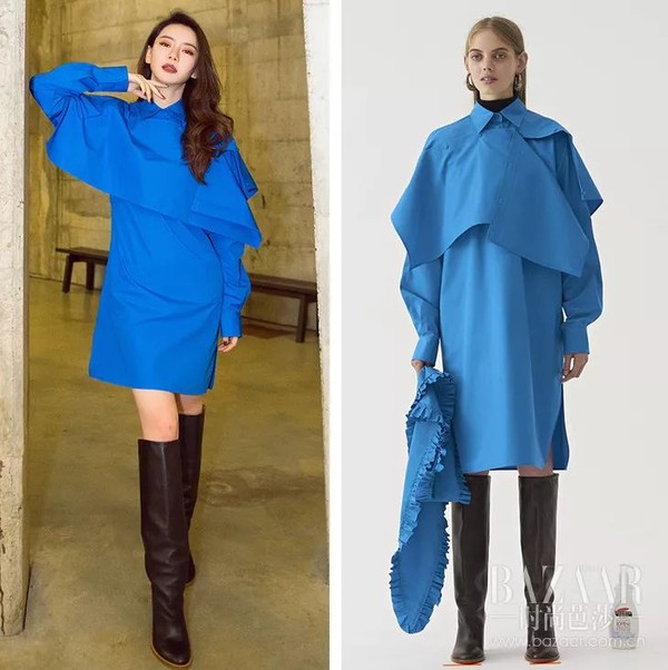 同样是蓝色的衬衫裙,戚薇则颇有心机地选择了斗篷的设计,充分遮住了上半身的肉肉。再配上她的“大波浪”卷发和长靴,让她看起来又骨感又摩登~