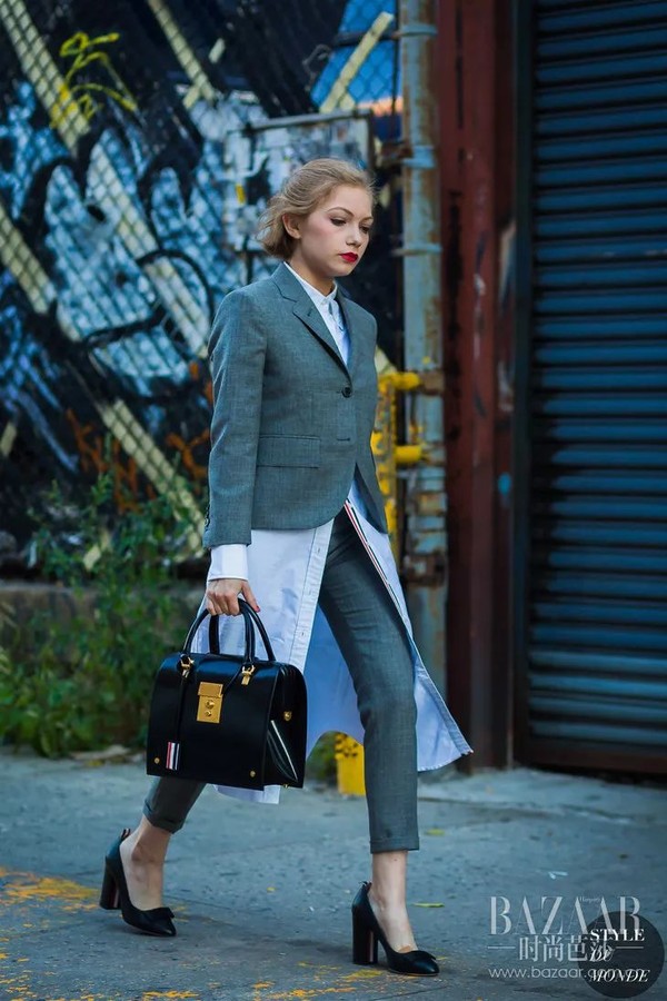相应地,你还可以在整套look的外面加一件小西服来增强层次感,这样一秒就能从柔美模式过渡到帅气模式,跟气场十足的红唇也十分相配~