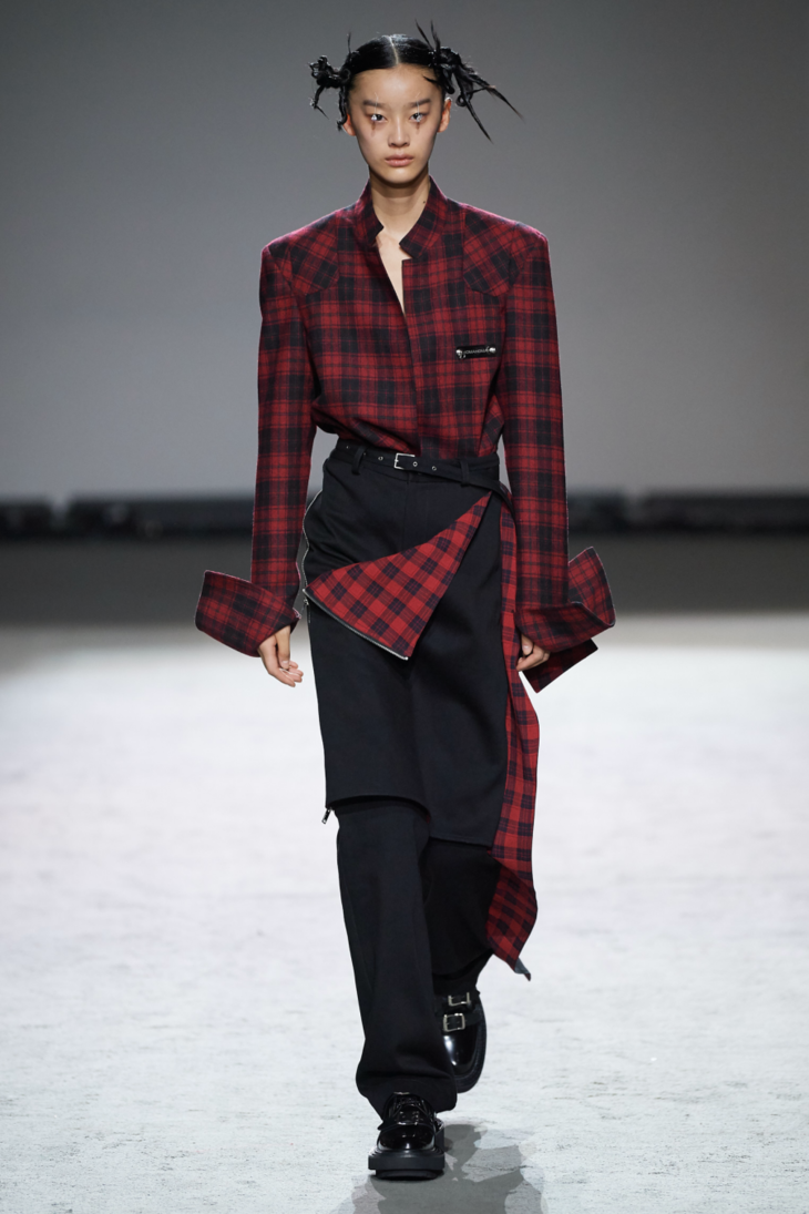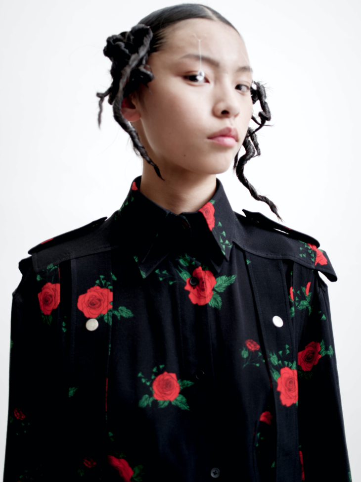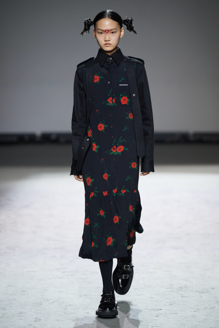 蔷薇印花,加之数字代码编写的NOMANOMAN品牌标识,以平面的方式表达了蔷薇十字的主题。源自17世纪的着装元素让服装的形态更为修长。对经典衬衫、西装、T恤以及牛仔裤的线条和轮廓的重组突出了女性的神秘感。
