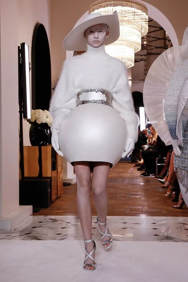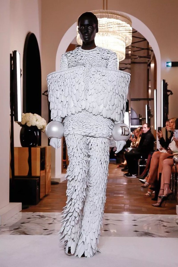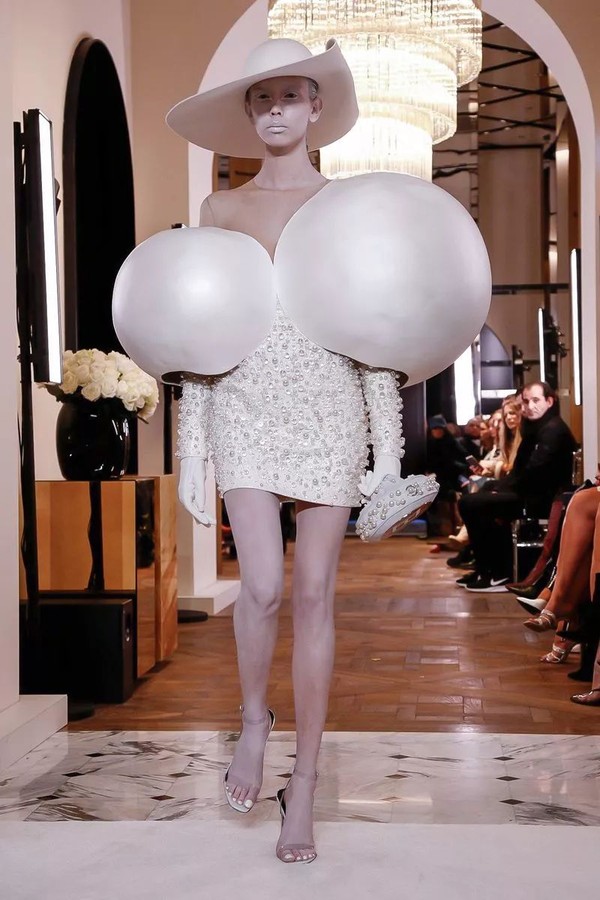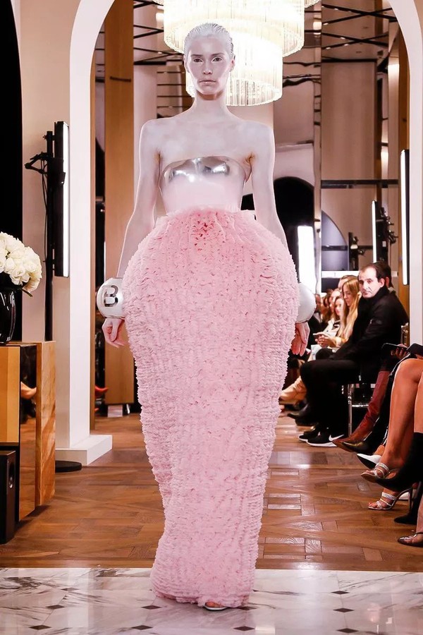 除了外星人般的白色妆发,Oliver用极具未来主义精神的球形设计把我们召唤至未来,球形裙子、紧身胸衣和袖口,以及印有全新“B”标志的球形手袋。让模特们看起来熟悉却遥不可及,仿佛不属于这个时代,此刻却又真真切切地属于当下,并成为历史的重要一刻。
