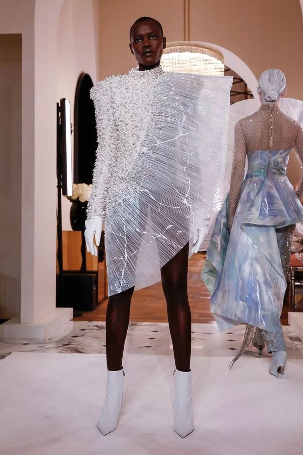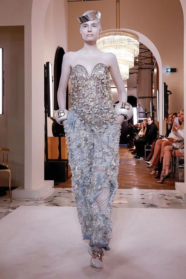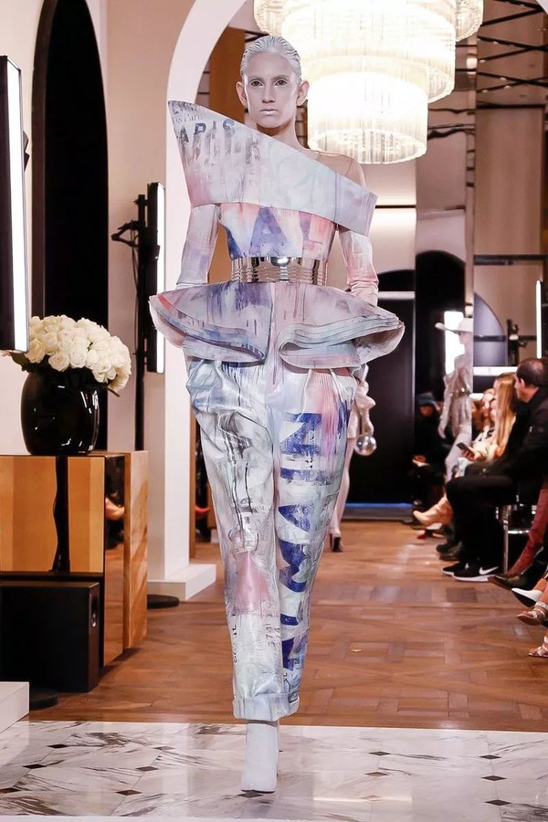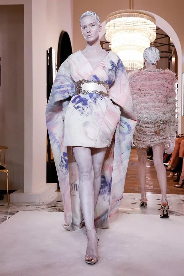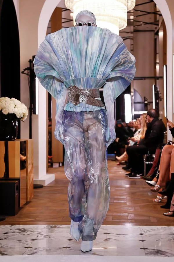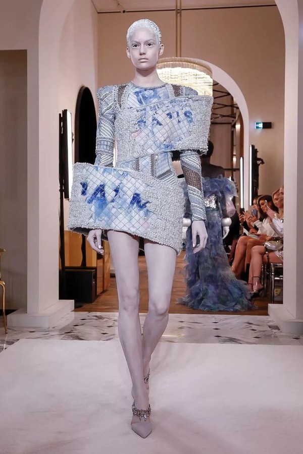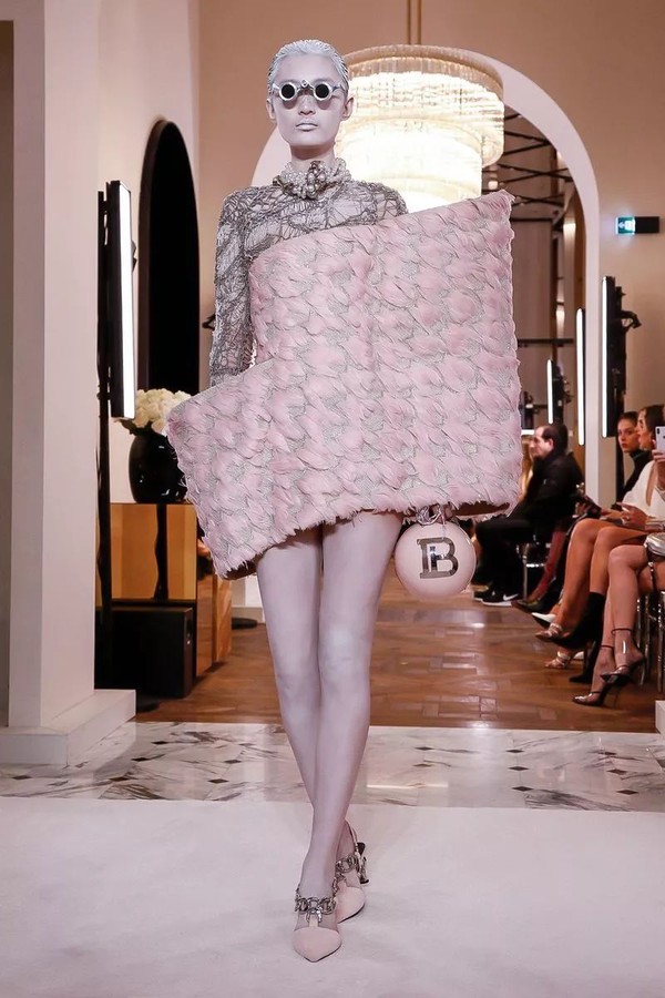 极少出现在高定中的涂鸦元素在这里得到了最温柔的绽放,通过吹制、涂抹、喷绘的手法,将BALMAIN PARIS、新logo"B"被赋予了柔软的棉花糖色调,蓝色,粉色和薰衣草色出现在了不规则的超大廓形褶皱上衣中,如一个个极简的抽象派艺术品,又如绚烂的温柔极光。
