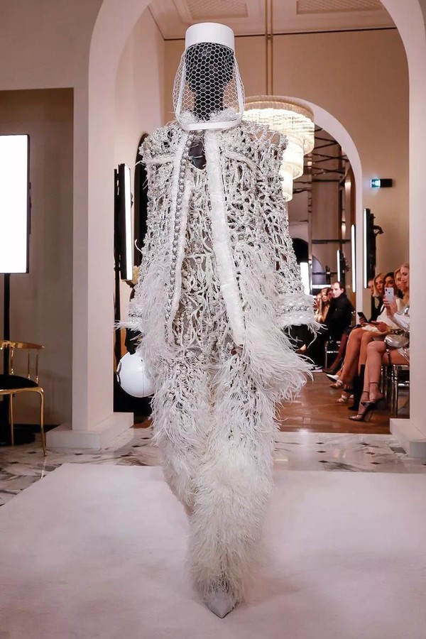 这次Olivier特意使用了“一种现代羽毛”——它本质上是一种新品种的针织品,用手工染色的意大利鸵鸟毛来替代本该使用的细线,这些羽毛共花费六位工匠1200个小时将它们打结编织在一起,配上施华洛世奇珍珠与水晶,以致敬Pierre Balmain生前十分钟爱的羽毛。