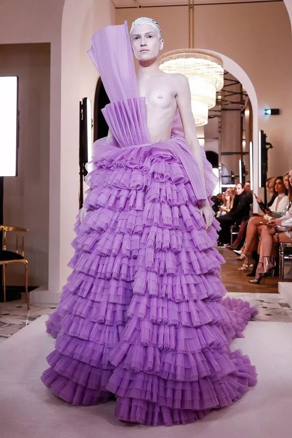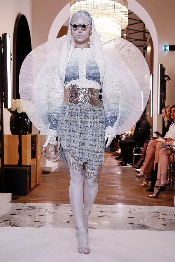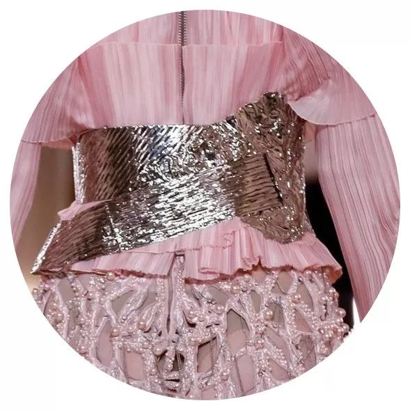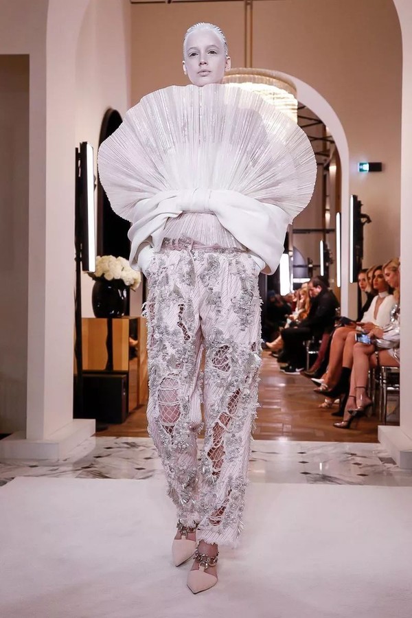 19春夏系列出现过的巨型褶皱袖肆无忌惮地占领了高定秀场,质地硬挺的褶皱薄纱是打造浮夸前卫廓形地不二之选。寡淡柔和的面料被打破,重塑为多样立体的丰富视觉美感,将优美与高贵巧妙糅合,重现BALMAIN核心DNA中毋庸置疑的华丽。