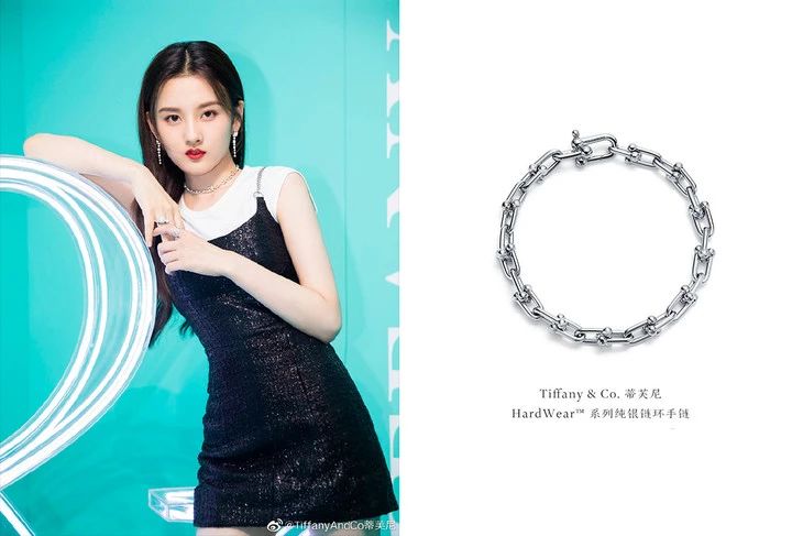 除了时装品牌外,很多珠宝品牌也都早早的推出了这样的Chain Necklace,比如Tiffany就推出更为秀气优雅的细锁链,宋祖儿脖子上这条就是两条手链拼接而成。