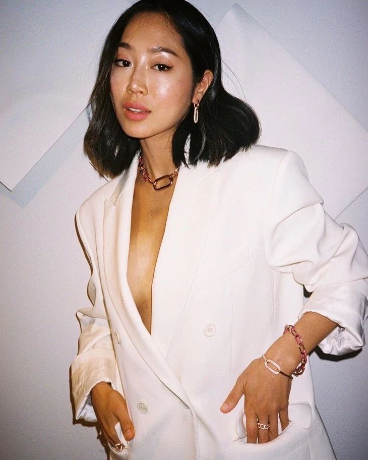 像Ammie Song这样的不规则大小项链更加抢眼,和手链耳环进行呼应,她一改往日风格,真空上阵,只为给这条Chain Necklace留一个C位!