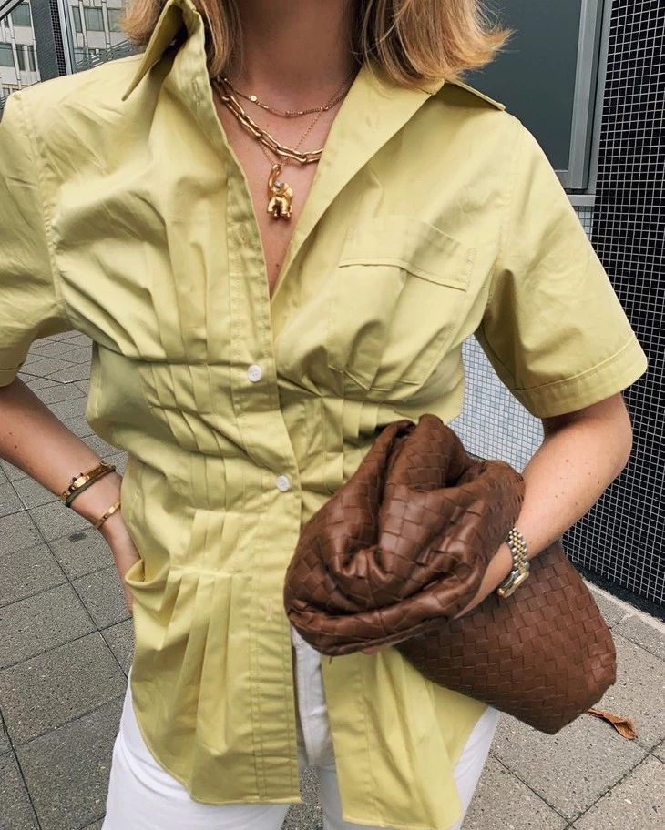衬衣的设计冥冥中就是为这样的项链而生,领口一开,女人的小心思都藏在这小小的一片露出之中,增加小象挂坠让普通的锁链多了一份童真。