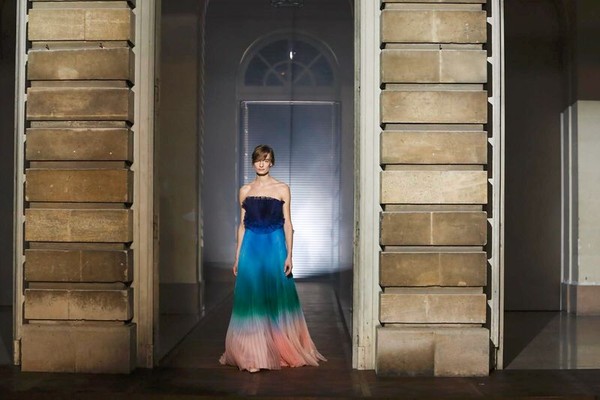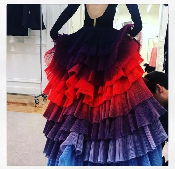 “这两条彩虹色的晚礼服花了最多的时间(制作)。首先需要一个经验丰富的工匠把30米长的白布手工染上颜色,并进行2~3次调整才能做出我们最终理想的色调。接着,这些面料需要被送去做出褶皱,最后才能用来做衣服。我们大概花了三周的时间,仅仅用在制作面料上。”工艺仍然是Givenchy高级定制核心中极其重要的一部分。Clare对此倍感骄傲。