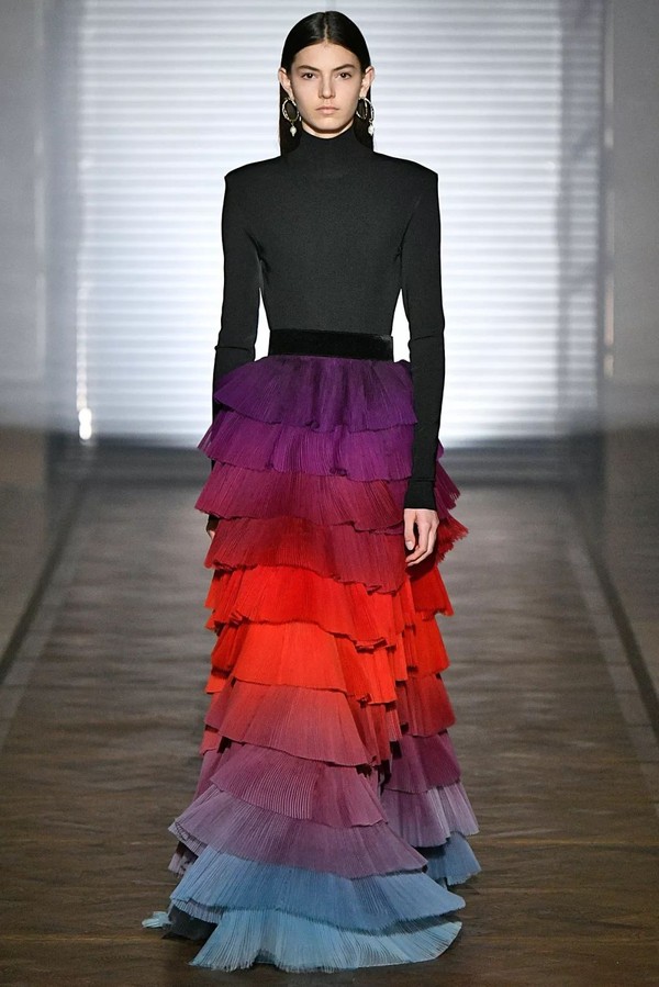 她还在Hubert de Givenchy的档案库里惊喜地发现这位设计大师在熟练地驾驭黑白时装之外,对色彩、图形和动物纹也拥有浓厚的兴趣。于是,她在白色的高腰裙上加上黑色的圆点,用奢华的羽毛和细腻钉珠衬托女性内心的野性,并用手工染制的百褶裙诠释彩虹般绚烂的色彩。
