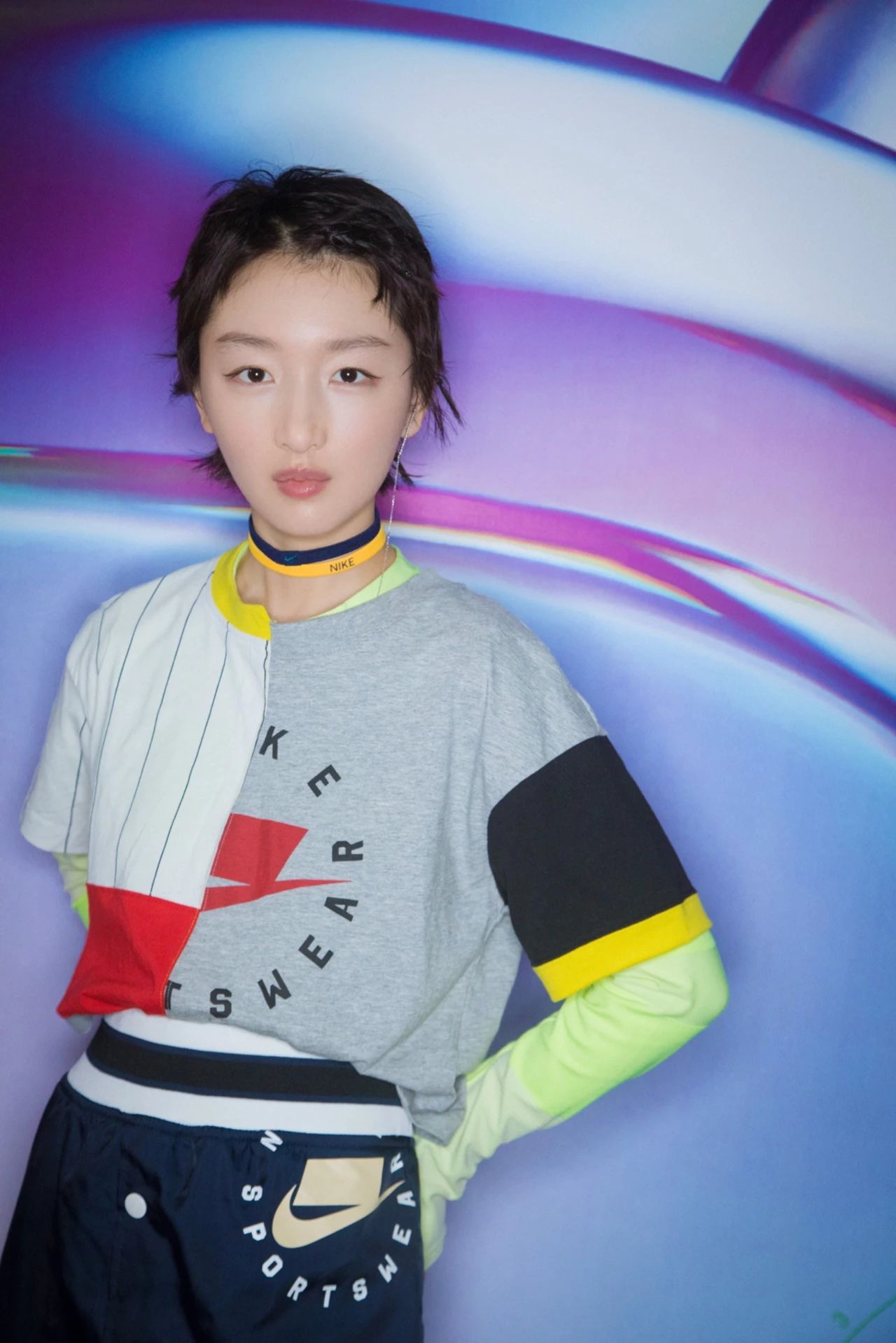 短发的周冬雨率性十足,单眼皮加上无辜下垂的狗狗眼线,增添了几分小女孩的灵气。