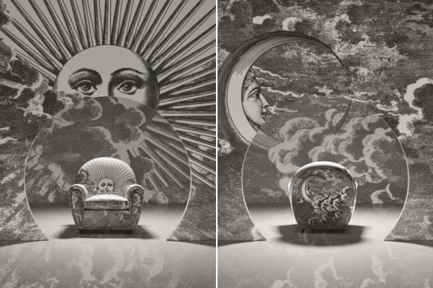 Fornasetti重新演绎Poltrona Frau标志性作品Vanity Fair XC扶手椅,日升月悬,风驰云卷,Fornasetti的插画意在致敬Poltrona Frau 2024 “梦幻系列(Imagine Collection)”,该系列即将于米兰设计周期间亮相