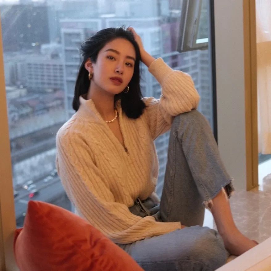 杨采钰上身的这件半高领的拉链Polo衫日常百搭,是实用派的选择。拉链的设计让高领毛衣变得具有呼吸感,罗纹硬挺的材质让立领部分有型却不会太过夸张。这时空荡的脖颈就需要一条项链来让毛衣变得精致。