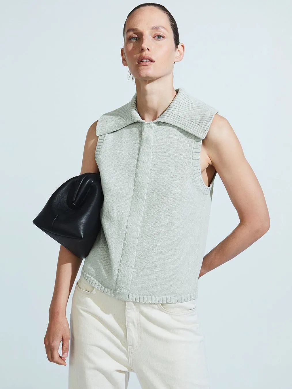 这种款式的针织衫只用一个领部Polo的设计来凸显基础单品的百搭,而柔软的面料更加强调了它低调日常的属性。