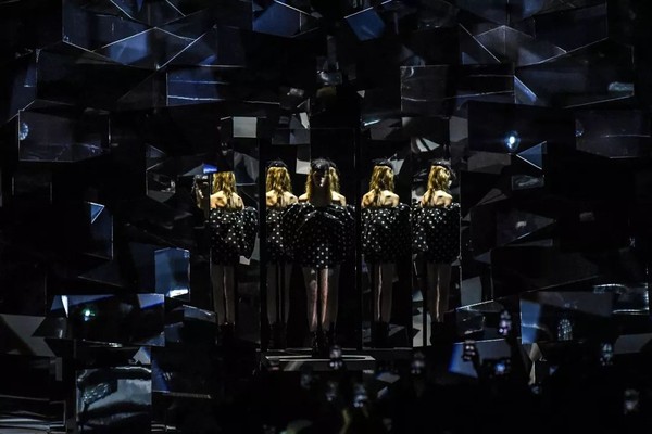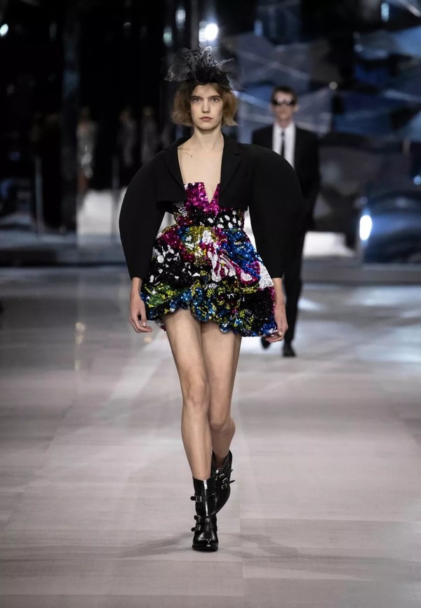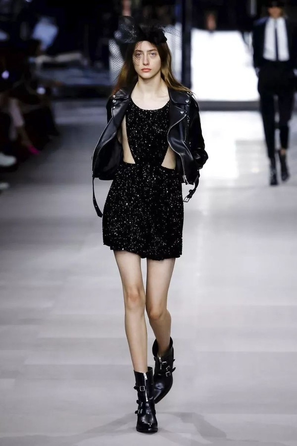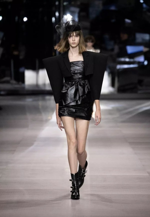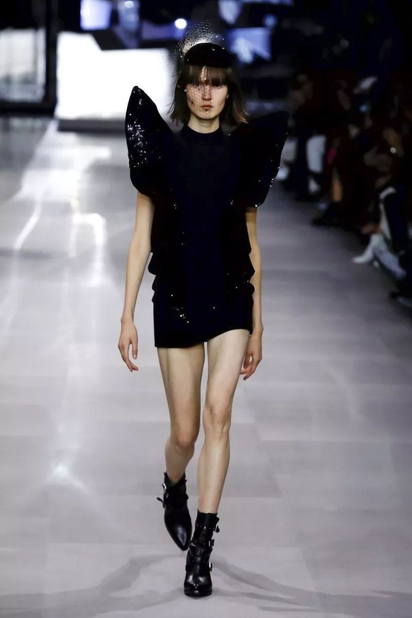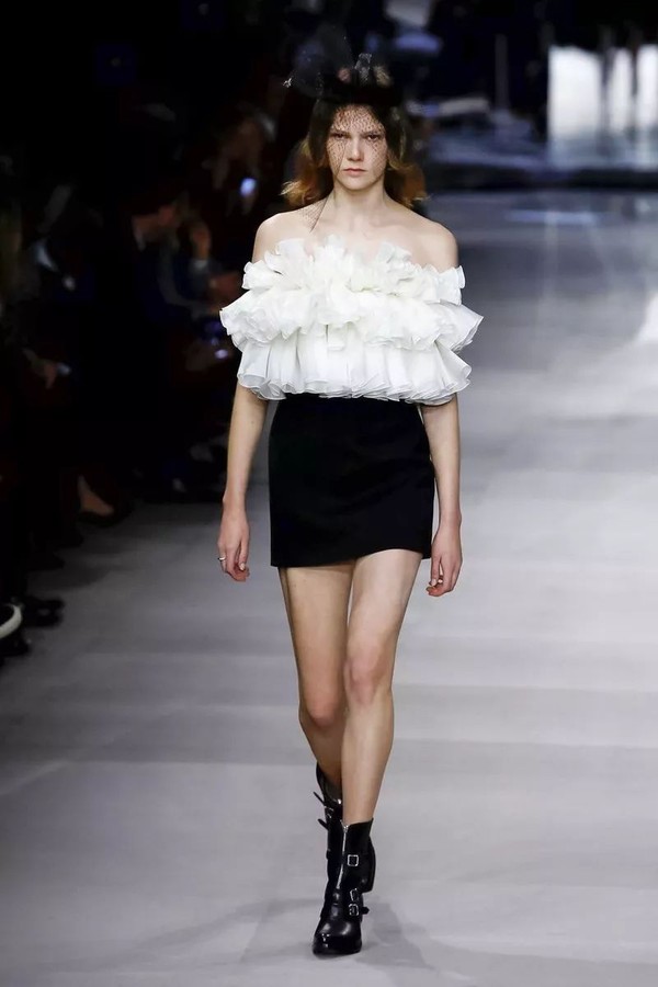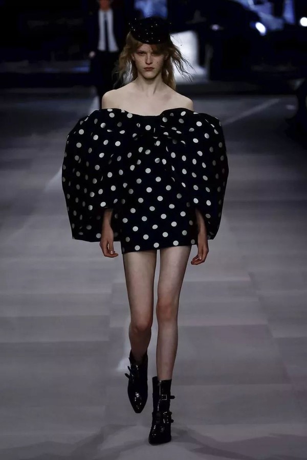 此次HediSlimane的CELINE首秀在巴黎荣军院举行,随着La Femme的《Runway》响起,由Slimane本人设计的装置打开,来自英国的Hanna Motler为本季开场。她穿着一件短至大腿根部的波点露肩迷你裙,外面装点着一个硕大的蝴蝶结,头上还带着有网纱的礼帽。无论从哪个角度看,都像在拆开一个礼物。